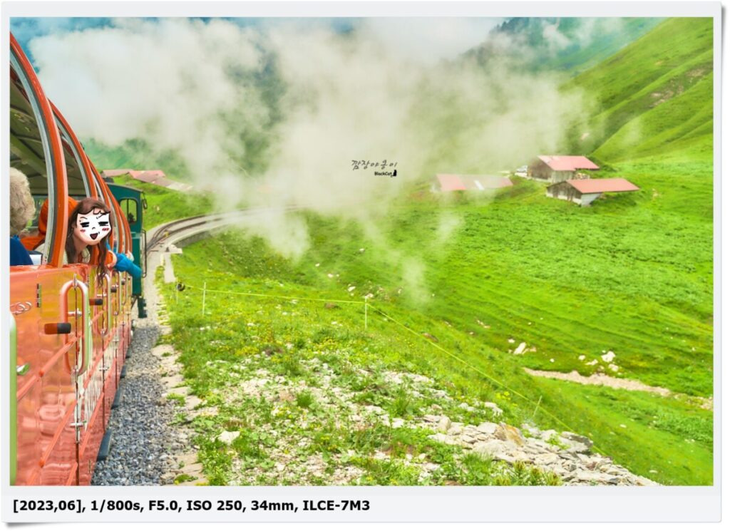 4일차까지 엄청 좋았던 날씨는 5일차부터 구름과 함께 비가 오는 날씨들이 많았는데요. 이날도 보다시피 구름이 잔득끼어 풍경을 볼수가 없었답니다. 지금은 그나마 좀 낳아서 파릇파릇 초목이 좀 보이는 거지 올라가는 내내 온 세상은 하옇고 보이는건 빨간 증기기관차와 주변에 함께 탄 사람들 밖에 없었네요.