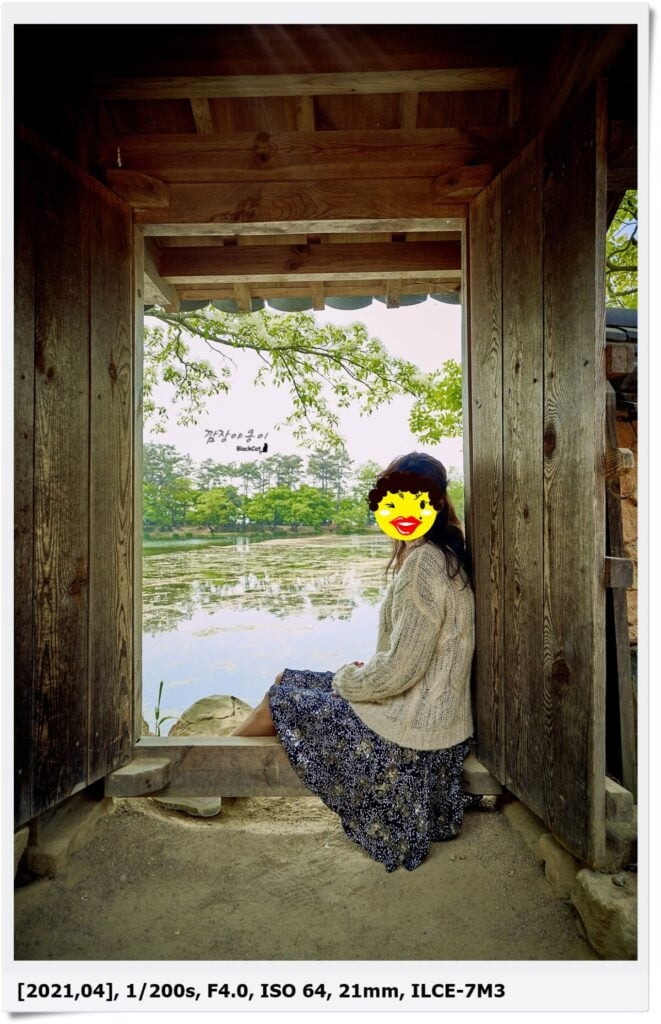 내부에서 보면 나무문이 있는데 이문을 열면 바로 앞 못이 보입니다. 이곳을 배경으로 사진을 찍어도 잘 나온답니다. 많은 분들이 줄서서 사진 찍고 나가시네요 ㅎ 이곳이 포토존 이랍니다!