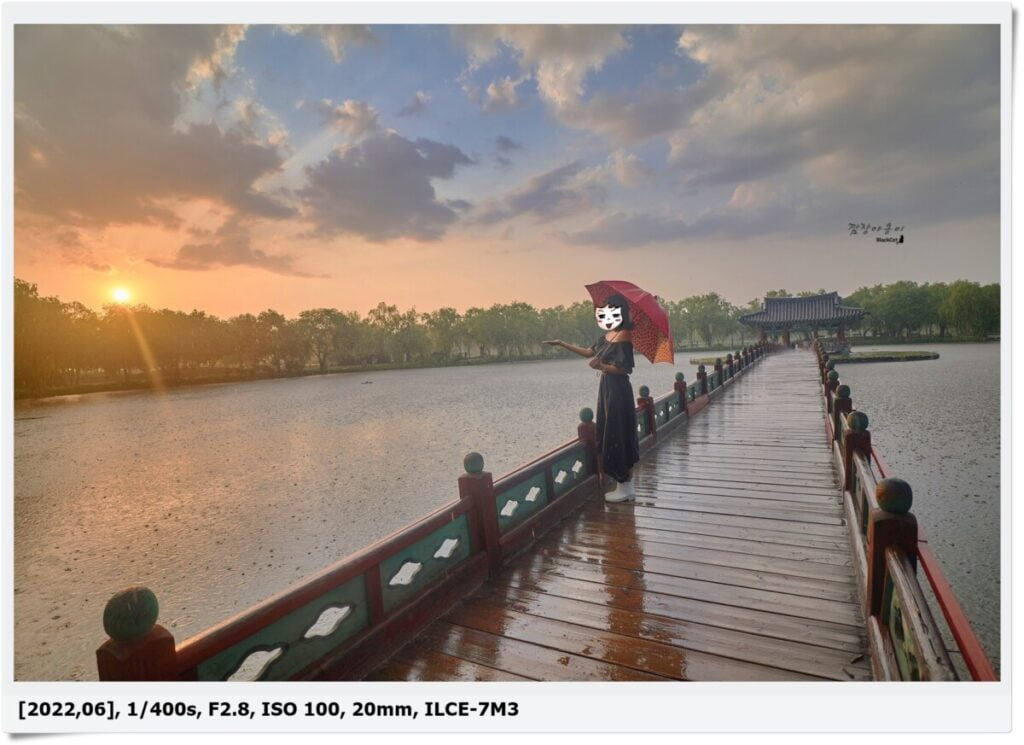 사실 궁남지에서 가장 유명한 포토 스팟은 궁남지 중앙에 위치하고 있는 섬 위의 정자라 불리는 포룡정 안에서 혼자 앉아 있는 걸 멀리서 찍은 사진인데요. 그 사진을 찍기 위해서는 줄이 길게 늘어서 있다고 했는데…..갑작스레 쏟아진 비로 인해 너무 많은 사람들이 포룡정 안에 있어 줄이고 뭐고 아예 찍을 수가 없었네요. 사람들이 아무도 없을 때 다리 끝에 포룡정이 보이게 찍으면 진짜 이쁘던데.. 아쉽네요.