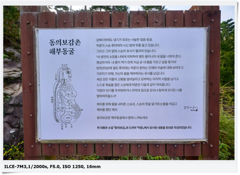 허준이 스승 류의태의 시신을 해부하는 장면을 묘사해둔 해부동굴이 있습니다. 이 해부동굴의 내부는 소설 '동의보감'과 인기리에 방영되었던 드라마 '허준'을 모티브로 해서 제작되었다고 하네요.