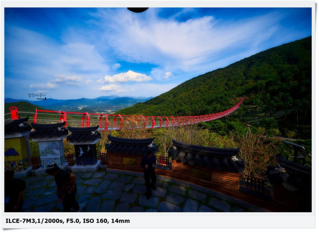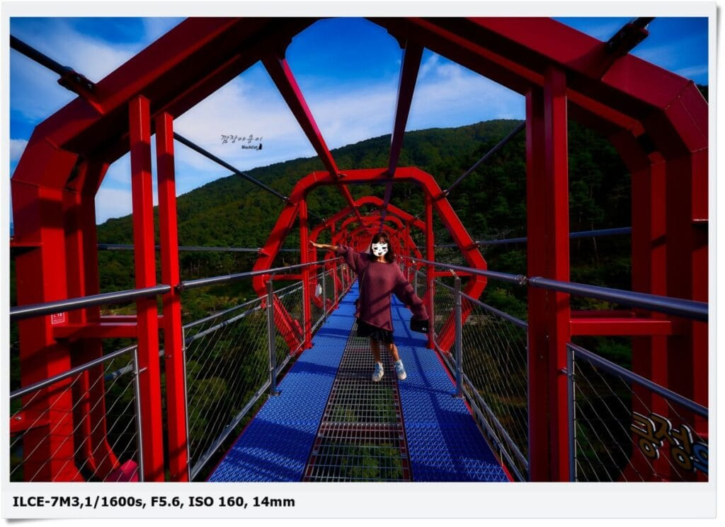 엄청 튼튼해 보이는데 생각보다 흔들림은 좀 있습니다. 확실히 흔들다리 맞습니다! 와이프가 처음에는 다리가 흔들려서 주춤하더니 점점 익숙해지는지 나중에는 포즈도 취하고 예상보다 잘 걸어가네요.